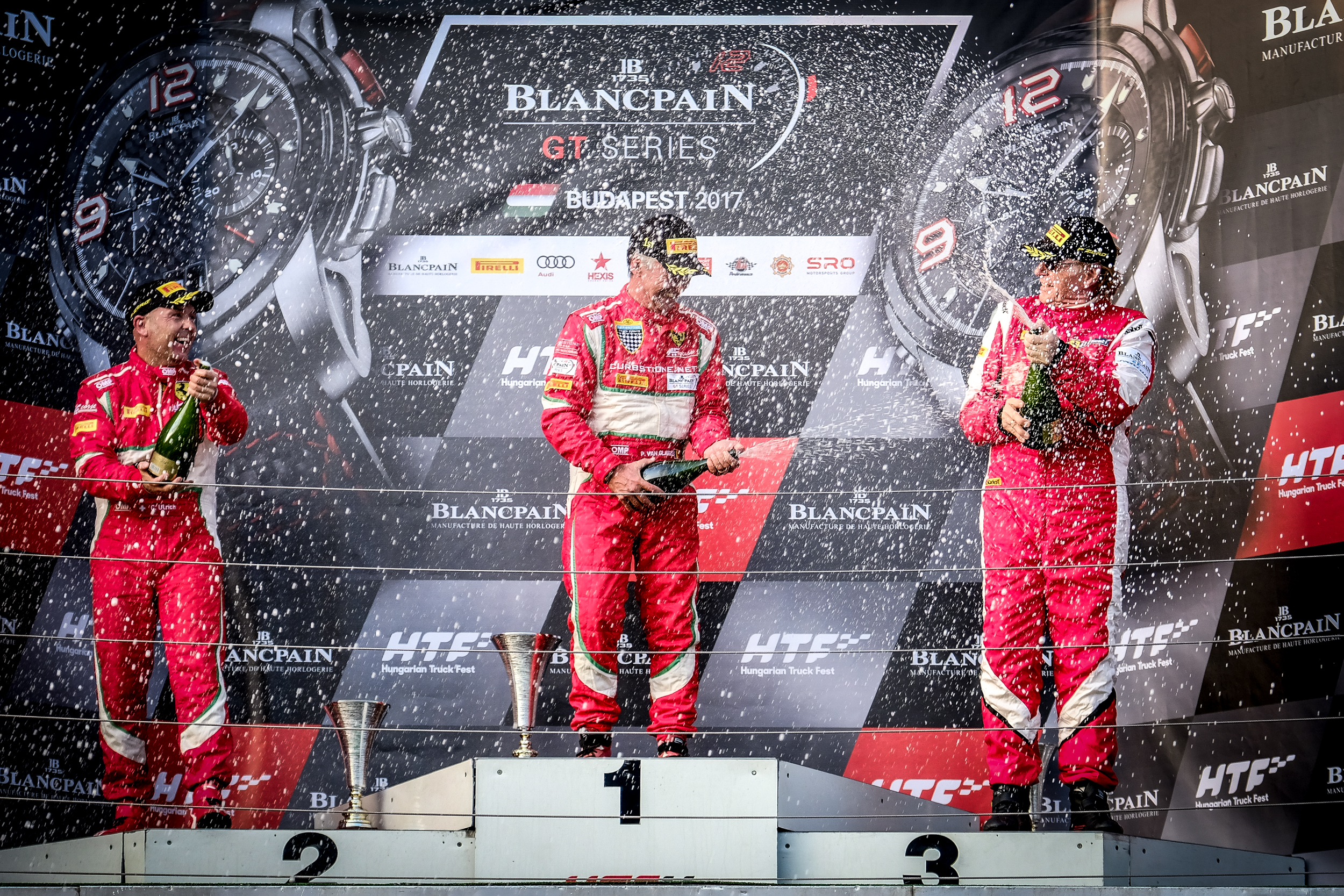 3. The Overall podium following Saturday’s Blancpain GT Sports Club Qualifying Race with, from left to right, Christop Ulrich (#51 AF Corse Ferrari 458 Italia GT3), Patrick Van Glabeke (#488 AF Corse Ferrari 488 GT3), and Klaus Dieter Frers (#3 Artega Rennsport Ferrari 488 GT3)