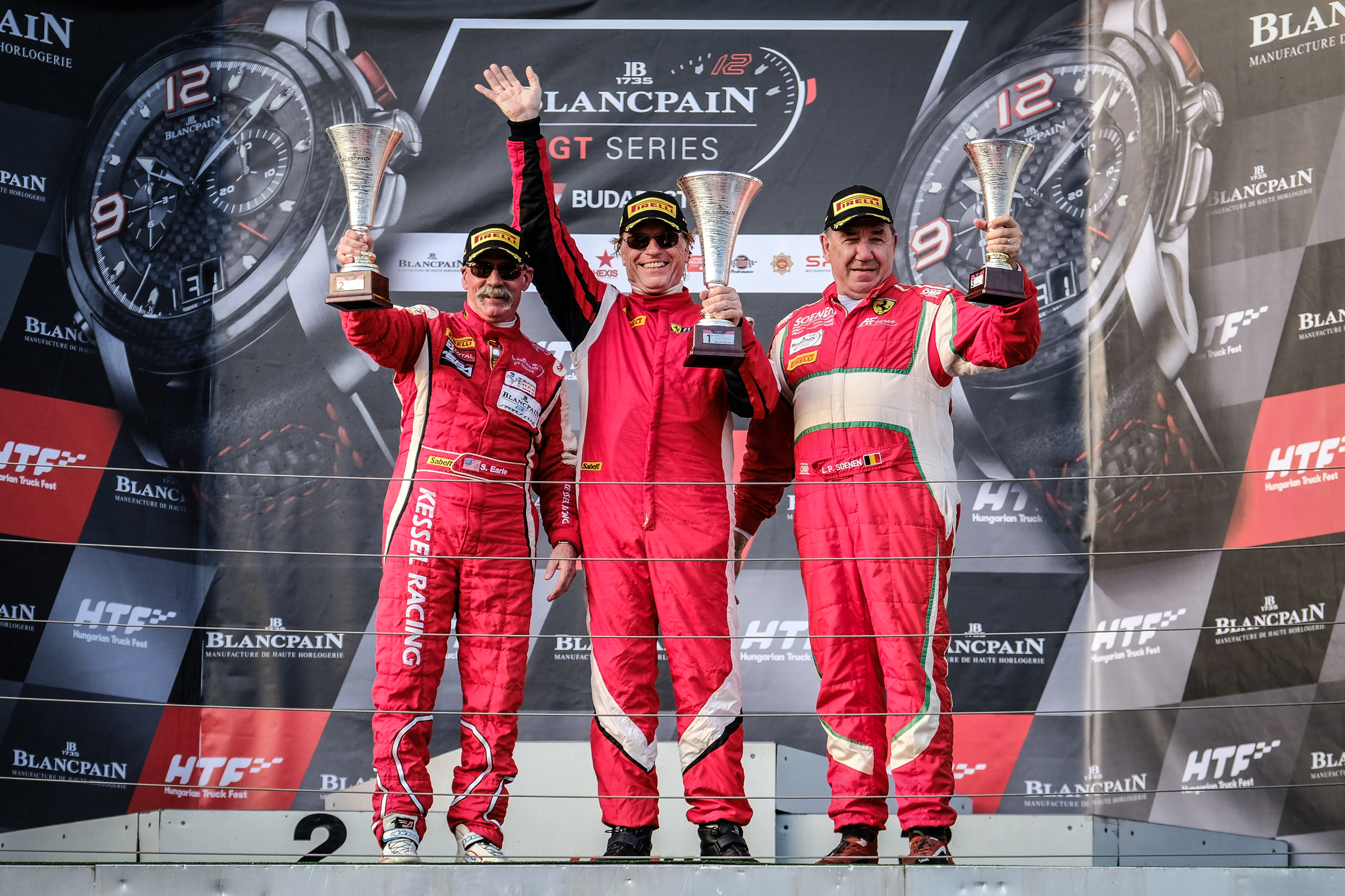 2. The Iron Cup podium following Saturday’s Blancpain GT Sports Club Qualifying Race with, from left to right, Stephen Earle (#111 Kessel Racing Ferrari 458 Italia GT3), Klaus Dieter Frers (#3 Artega Rennsport Ferrari 488 GT3), and Louis-Philippe Soenen (#50 AF Corse Ferrari 488 GT3)